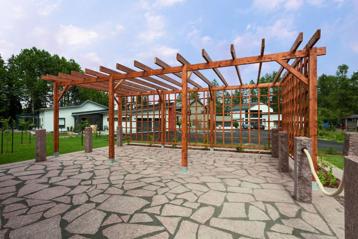 Pihan kivipohjat tehtiin routimattomaksi ja kantavaksi. Kohteessa perinteisen puuterassin sijaan tehtiin kiviterassi, johon rakennettiin kivitolppiin köysikaide sekä puupergola. Talon jokaisessa sisäänkäynnissä on mittatilauksesta valmistetut kiviportaat. Kohteen paasikivet, graniittiliuskeet, portaat ja reunakivet valmistimme myös omasta, Haapalan punaisesta graniitista.