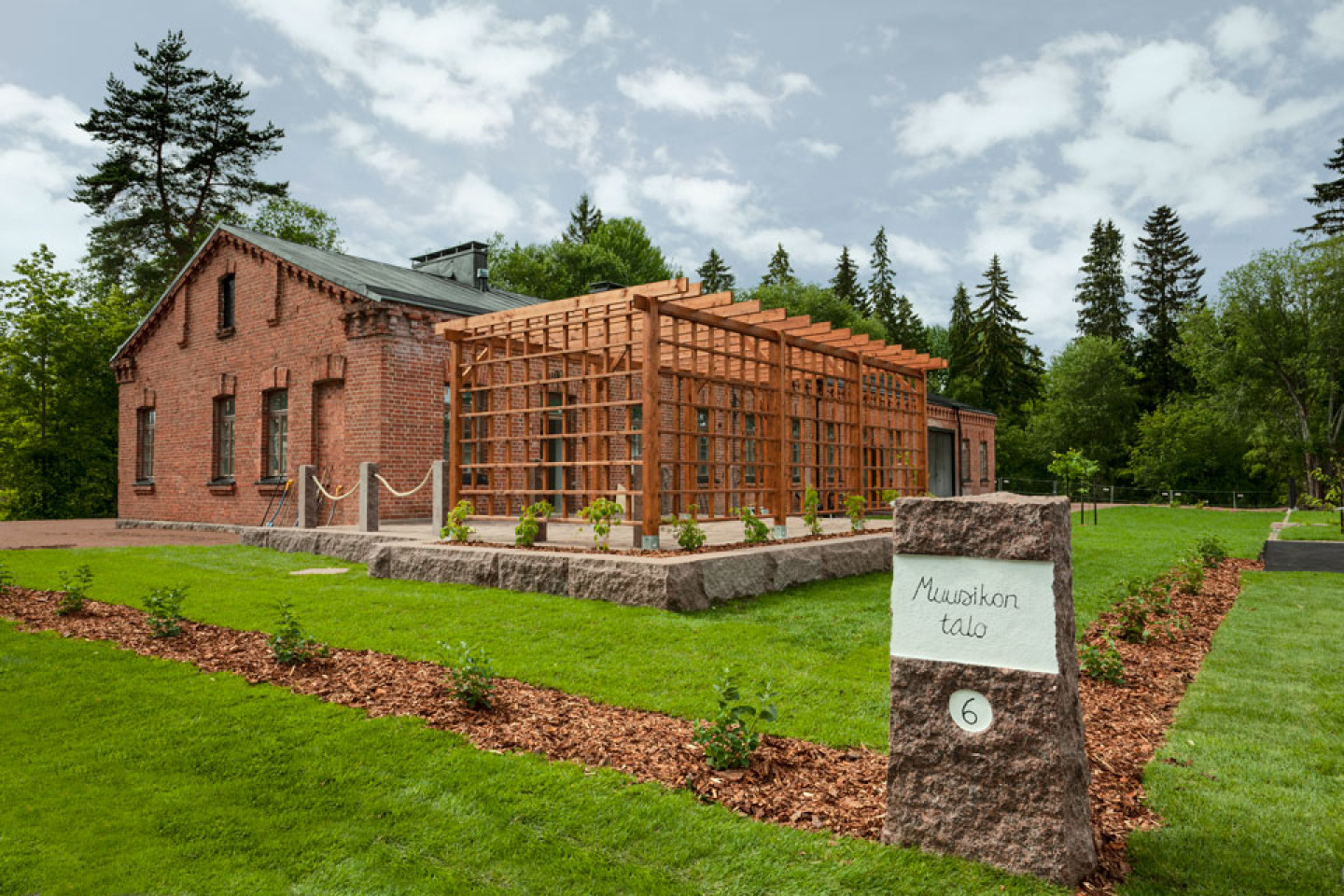 Pergolan materiaalina käytettiin ruskeaa kestopuuta, joka pidetään jatkossa ruskeana käsittelemällä se. Kasvillisuus valikoitui käytännössä helppohoitoisuuden ja yksinkertaisuuden perusteella, etupihan syreeniaidanne sopii rakennuksen aikakauteen ja luo ajan kanssa suojaa pihan oleskelualueelle. Pergolan villiviinit peittävät säleikköjä ajan kanssa ja kasvavat melko nopeasti.